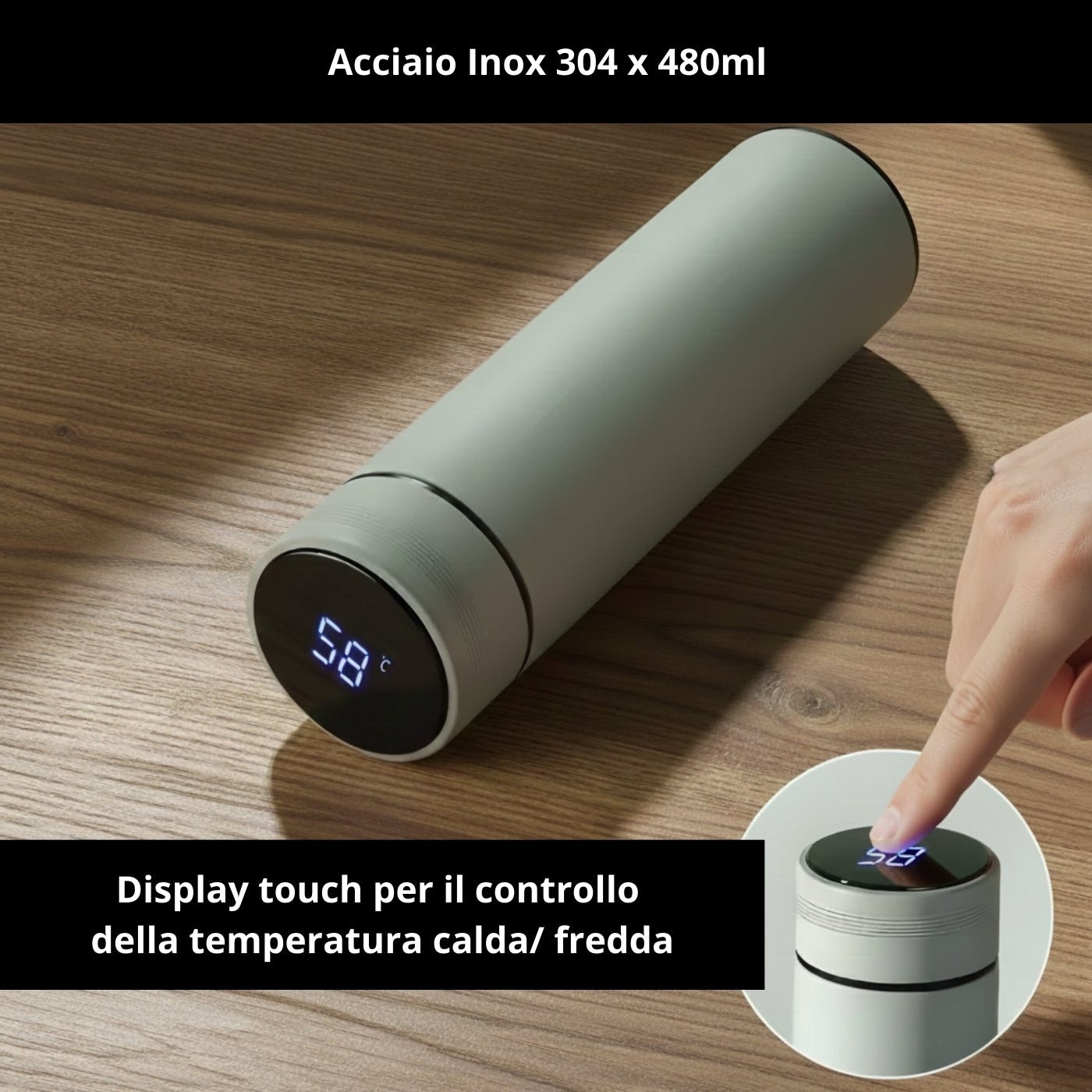 - Borraccia termica innovativa con schermo LCD touch che mostra in tempo reale la temperatura dell'acqua.